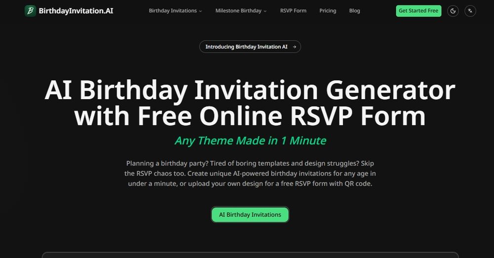 Birthday Invitation AI is an all-in-one platform for creating beautiful birthday invitations and managing RSVPs. Create personalized, print-ready birthday invitations in minutes using AI. Describe any theme in any language—our AI creates custom designs for you. Includes QR code RSVP tracking, real-time guest management, and automatic email reminders. Supports kids, teens, adults, milestone birthdays (1st, Sweet 16, 21st, 30th, 50th+), multiple languages, and a free RSVP form for custom designs.