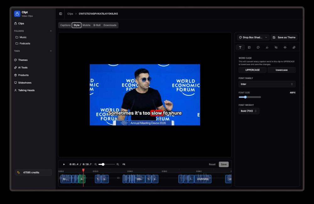 Clipt ingests videos from YouTube, X, LinkedIn, TikTok, Instagram and 50+ websites, or upload raw files. Create word-accurate captions with custom fonts, colors, and animation presets. Parallelized cloud renders keep your queue moving.