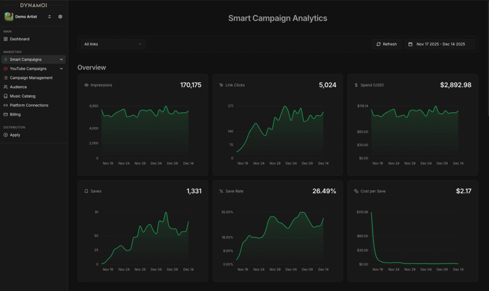 Spotify & YouTube growth. AdSense optimization. Automated Meta/Google campaigns optimized for saves and algorithmic lift. Unlimited Smart Links included, real-time metrics, and daily budget optimization. Starts at $10/day.