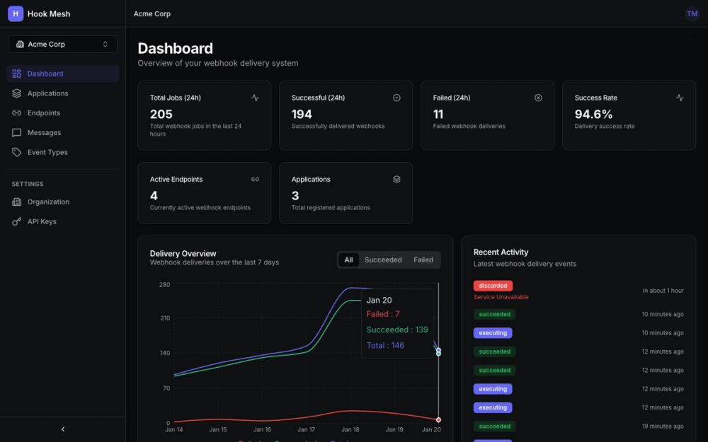 With Hook Mesh, you get battle-tested infrastructure out of the box: automatic retries with exponential backoff and jitter, circuit breakers that pause failing endpoints, and at-least-once delivery with idempotency keys.