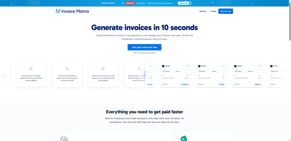 Built for freelancers and small businesses who value their time. No bloat, no complexity. Just the tools that help you focus on what you do best. Describe what you need, watch it happen. Our AI creates invoices, estimates, and quotes in 10 seconds. No templates to fiddle with, no manual data entry. Fast, accurate documents ready to send.