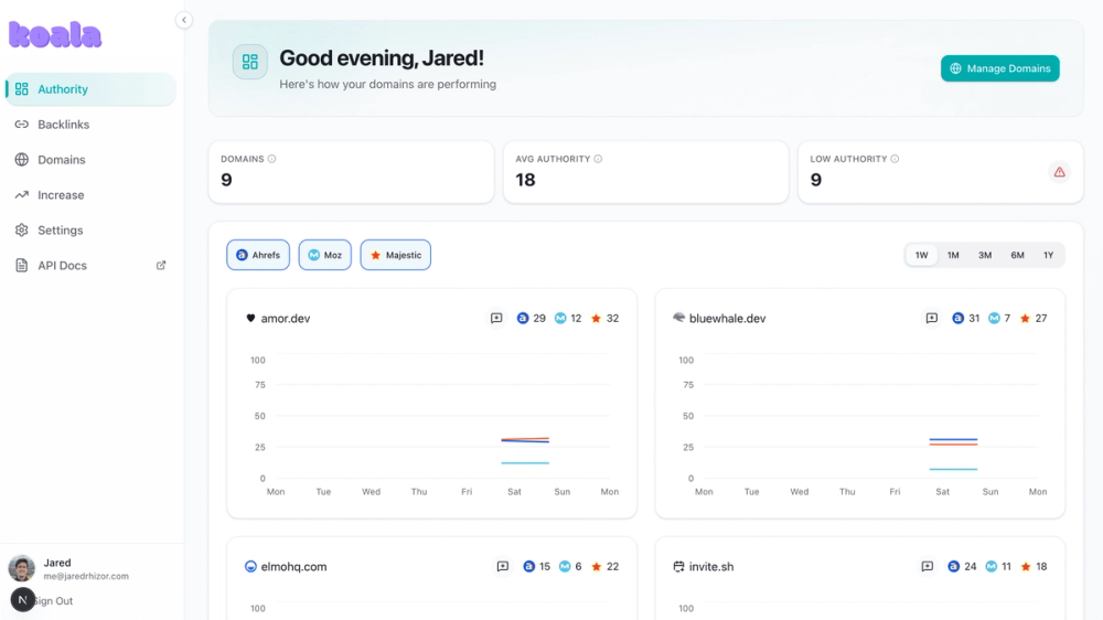 Koala simplifies SEO monitoring by consolidating critical metrics including Ahrefs Domain Rating (DR), Moz Domain Authority (DA), and Majestic Citation Flow, into a single, intuitive dashboard. Instead of checking multiple platforms manually, users can visualize historical growth with interactive charts and receive automated daily or weekly updates.