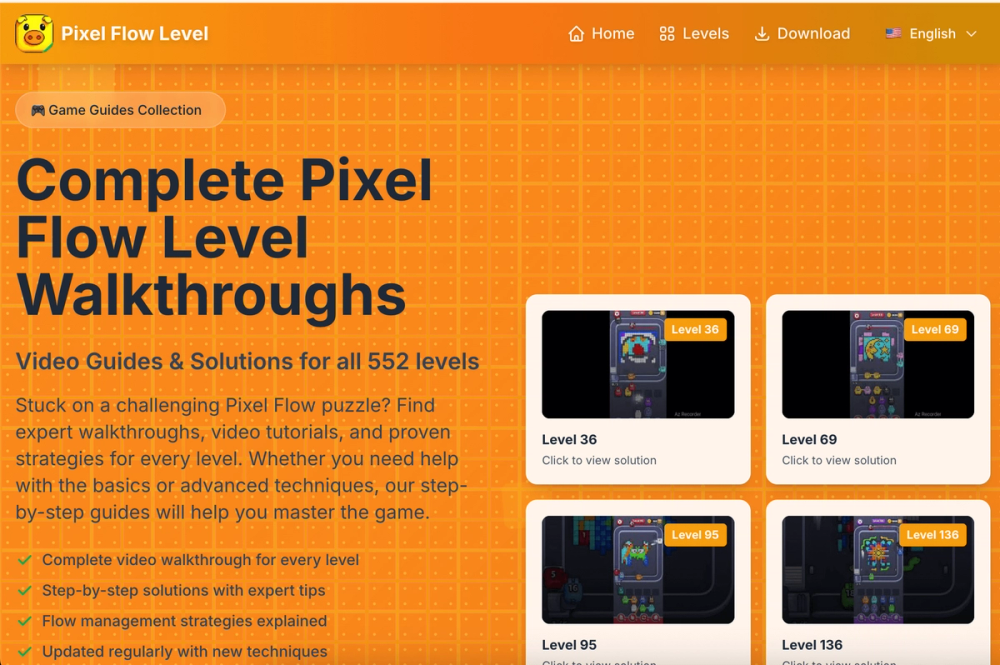 Complete Walkthrough Guide Pixel Flow Level is a comprehensive guide website offering video walkthroughs, strategies, and solutions for all 741 levels of the popular mobile puzzle game Pixel Flow.