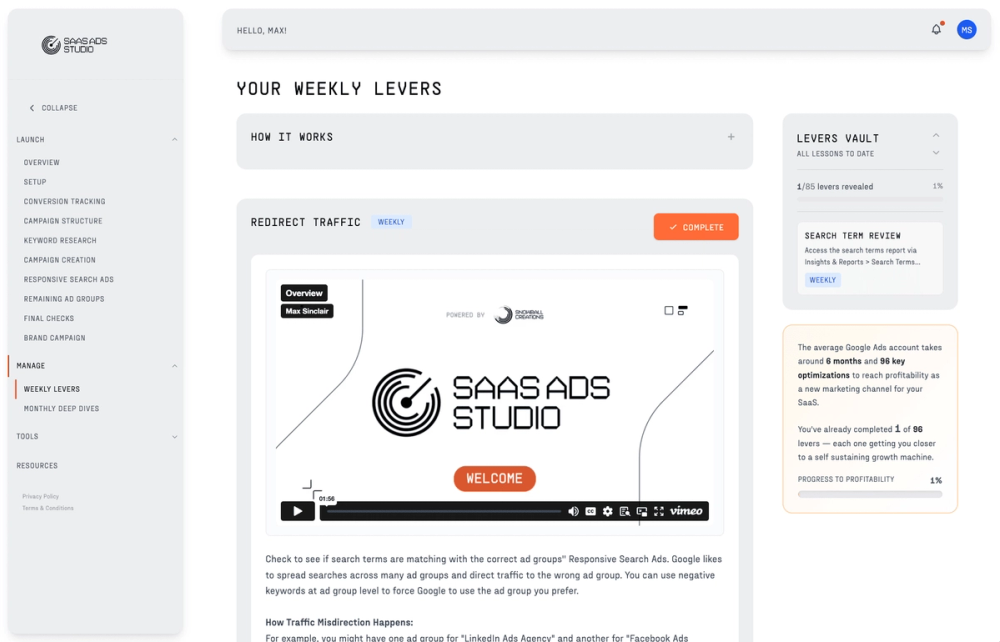 Launch profitable Google Ads for your B2B SaaS in a weekend — without hiring a paid ads agency. Build a tight, conversion tracked account the right way, then follow weekly tasks that improve results step by step. The system is split up into two sides, Launch and Manage Launch your first campaign in a weekend A step by step journey combining educational video content and AI powered tooling that uses your brand DNA to personalise outputs – all to make each step a joyous click of a few buttons and leave you genuinely understanding Google Ads like never before.